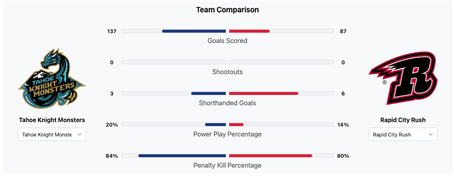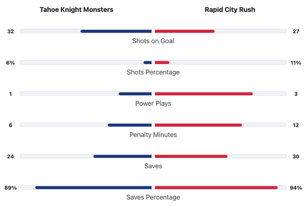The Tahoe Knight Monsters had five more shots. The Rapid City Rush had the better shot percentage. The Rapid City Rush had six more penalty minutes. #1 Jesper Vikman saved 24 shots for a 89% save percentage for the Tahoe Knight Monsters. #33 Christian Propp saved 30 shots for a 94% save percentage for the Rapid City Rush.