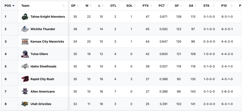 The Tahoe Knight Monsters have a record of 22-10-3 with 47 points in 35 games. The Knight Monsters are in 5th place in ECHL. They are in 2nd place in the ECHL Western Conference. They are still in 1st place in the ECHL Western Conference Mountain Division. They are in a playoff spot. They are still eight points into a playoff spot. They have the highest points percentage in the division. The Knight Monsters are five points away from the top spot in the ECHL and the top spot in the ECHL Western Conference.
