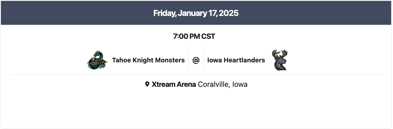 The Tahoe Knight Monsters take on the Iowa Heartlanders for the first time ever. It will be game thirty six on Friday, January 17th. It will be an away game. Puck drop is scheduled for 6:00 PM. This will be a conference game. This will be first game of the stint in Iowa and game seven of the nine game road trip.