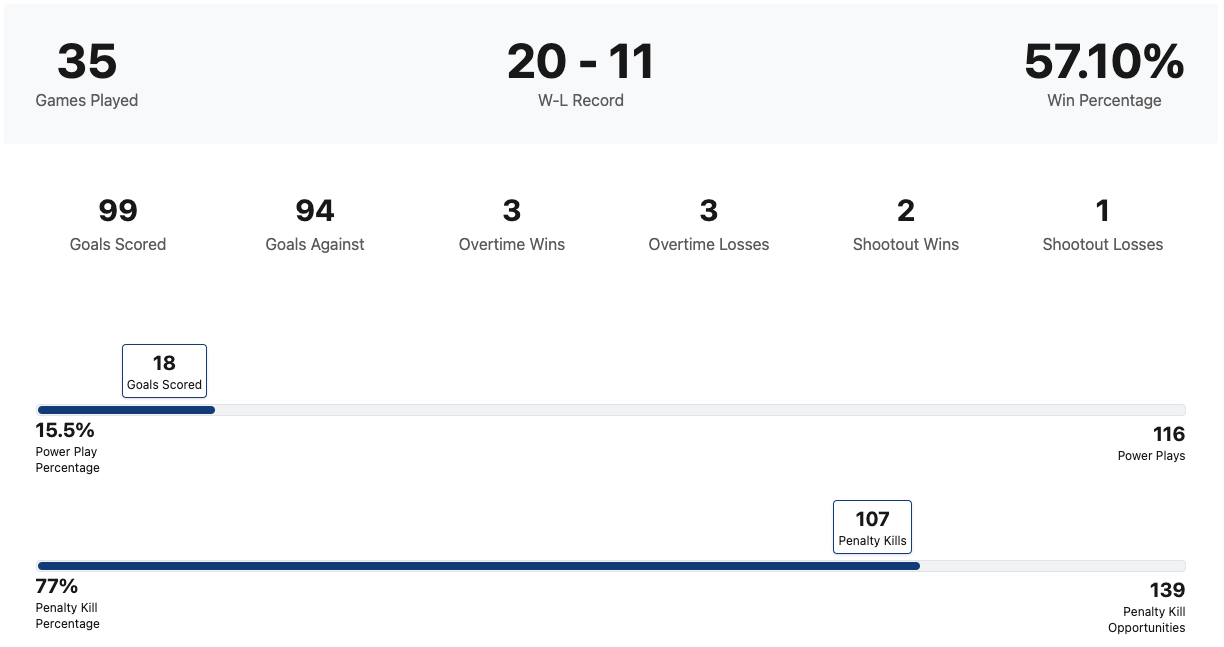 | Tahoe Knight Monsters | 35 | 22 | 10 | 3 | 139 | 113 | +26 | 47 |