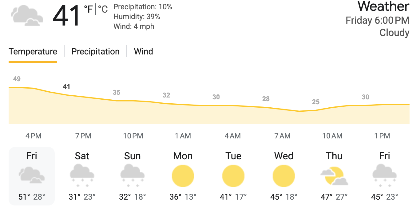 It will be in the lower 40ºs at puck drop. There may be some slight rain. I doubt there will be snow tonight. This will be warmer than the last few home games at puck drop.