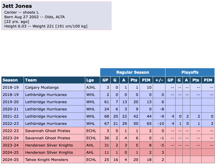 Forward Jett Jones has been recalled again from the Tahoe Knight Monsters to the Henderson Silver Knights. Jones has sixteen goals with four assists for twenty total points in twenty five games this season with the Knight Monsters. He has eighteen penalty minutes and a +/- of +2 this season in the ECHL. Jones has one goal with no assists for one total point in eleven games this season with the Silver Knights. He has two penalty minutes and a +/- of +3 this season in the AHL.