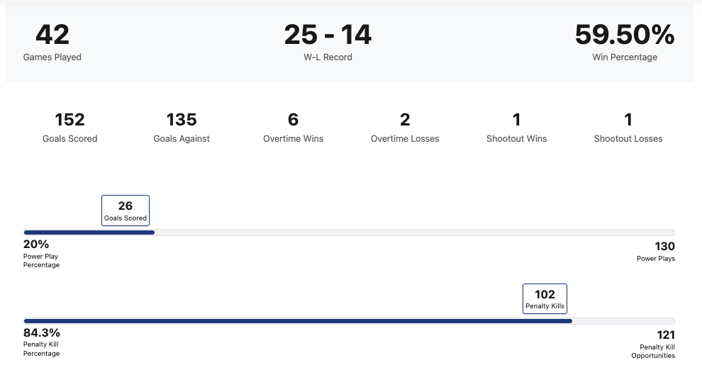 | Tahoe Knight Monsters | 42 | 25 | 14 | 3 | 152 | 135 | +17 | 53 |