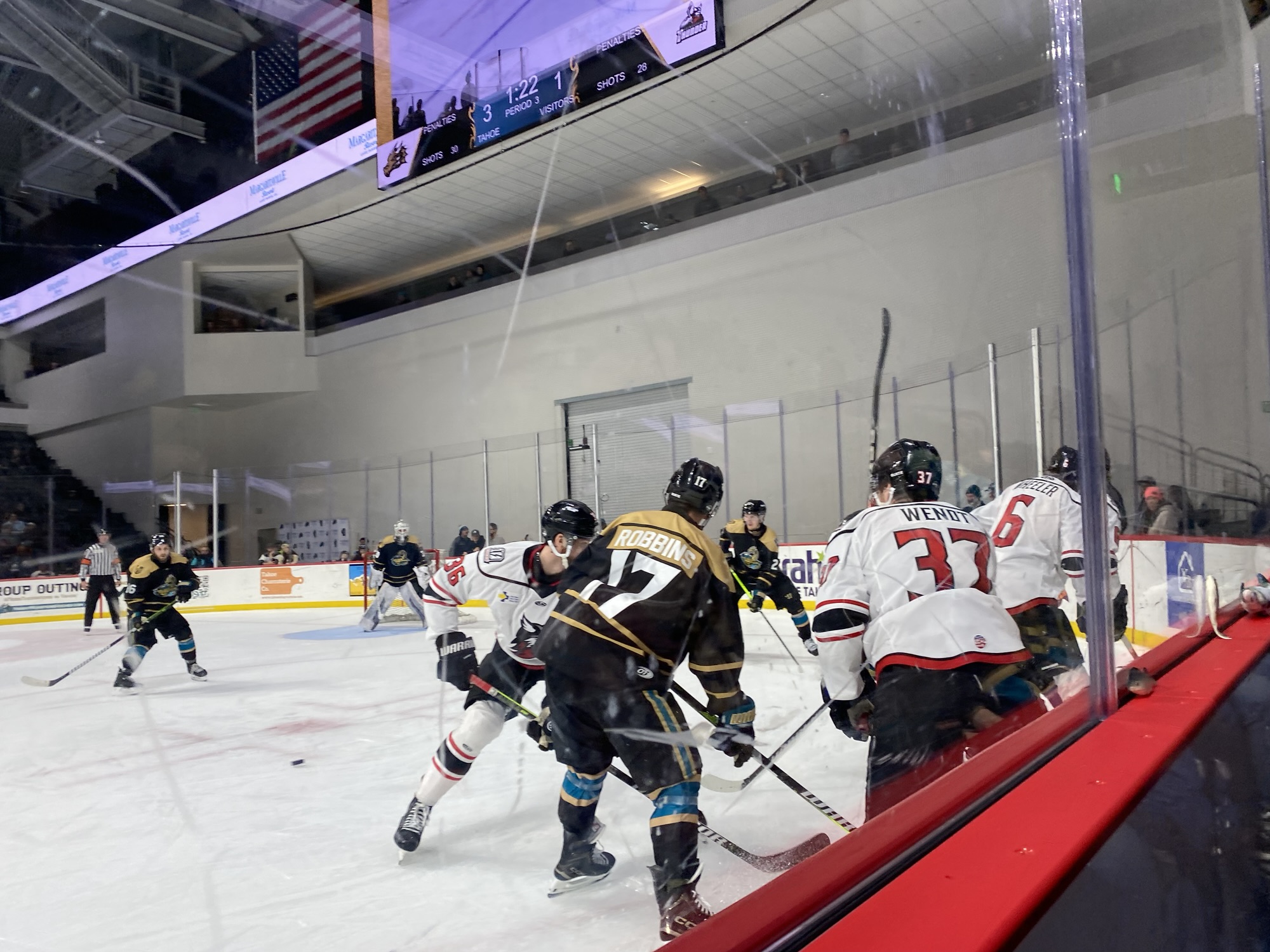 Prior to the start of the third period, the ice had to be repaired in front of the benches. The ref went over to the benches with a bucket and repairs were made in multiple spots. Aiden Girduckis of the Tahoe Golden Monsters came onto the ice for the third period but left the ice before play started. He was helped off. He did not return. The Tahoe Golden Monsters were playing with fifteen players in the third period. Four minutes into the third period, the Adirondack Thunder scored to bring the lead back down to one goal. The goal was scored by #19 T.J. Friedmann. His goal was assisted by #43 Kishaun Gervais and #7 Adrien Bisson.