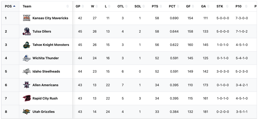 The Tahoe Golden Monsters have a record of 26-15-4 with 56 points in 45 games. The Golden Monsters are in 11th place in ECHL. They are in 4th place in the ECHL Western Conference. They are in 3rd place in the ECHL Western Conference Mountain Division. They are in a playoff spot. They are four points into a playoff spot. They have the third highest points percentage in the division. The Golden Monsters are eight points away from the top spot in the ECHL. The Golden Monsters are eight points away from the top spot in the ECHL Western Conference.The Golden Monsters are two points away from the top spot in the ECHL Western Conference Mountain Division.