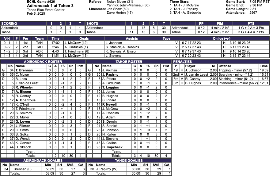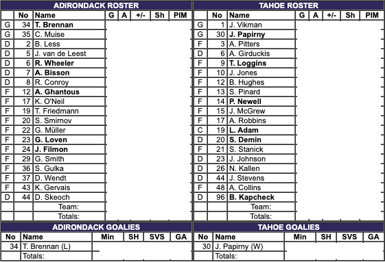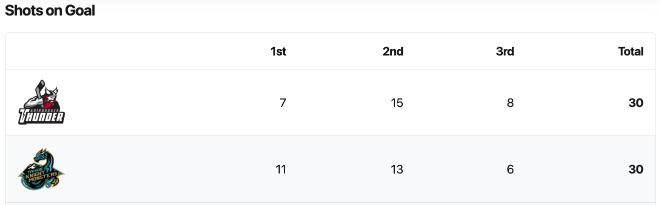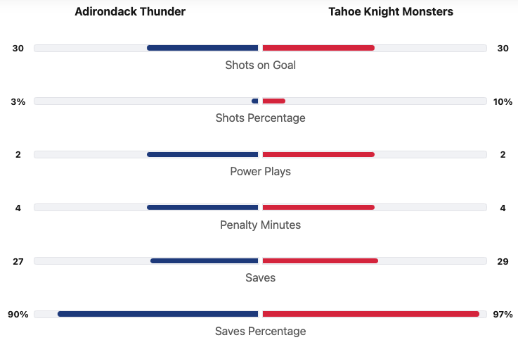 Both teams had thirty shots. The Tahoe Golden Monsters had the better shot percentage. Both teams had four penalty minutes. #30 Jordan Papirny saved 29 shots for a 97% save percentage for the Tahoe Golden Monsters. #34 Tyler Brennan saved 27 shots for a 90% save percentage for the Adirondack Thunder.