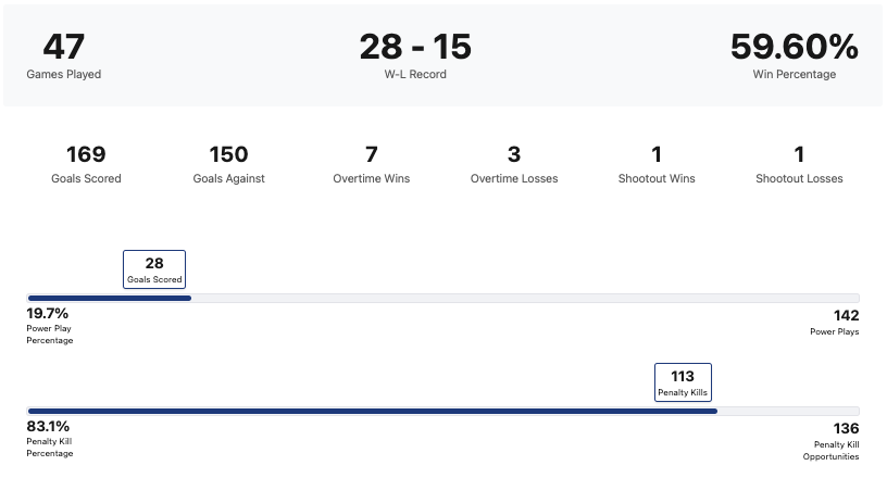 The Tahoe Knight Monsters have scored 169 goals so far this season. That is 3.59 goals per game. They have scored the third most goals in the ECHL this season. The Tahoe Knight Monsters have allowed 150 goals so far this season. That is the 18th least in the ECHL this season. That is 3.19 goals against per game. The Tahoe Knight Monsters have a goal differential of +19.