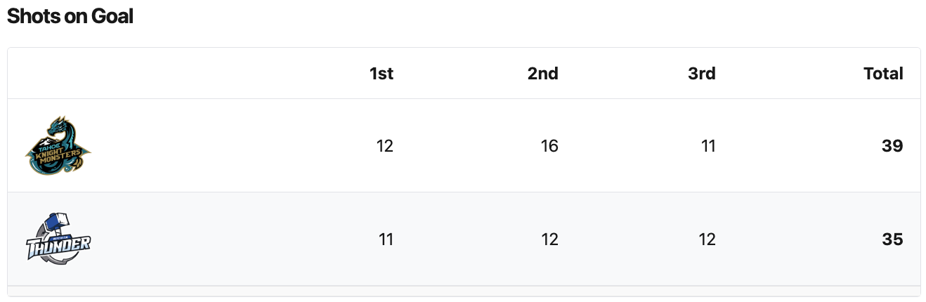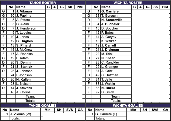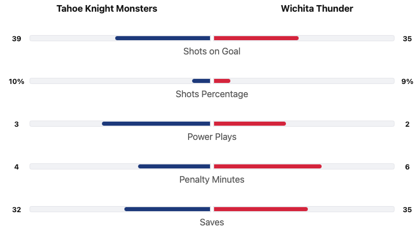 The Tahoe Knight Monsters had 4 more shots. The Knight Monsters had the better shot percentage. The Wichita Thunder had two more penalty minutes. #1 Vasper Vikman saved 32 shots for a 91% save percentage. #1 Gabriel Carriere saved 35 shots for a 90% save percentage.