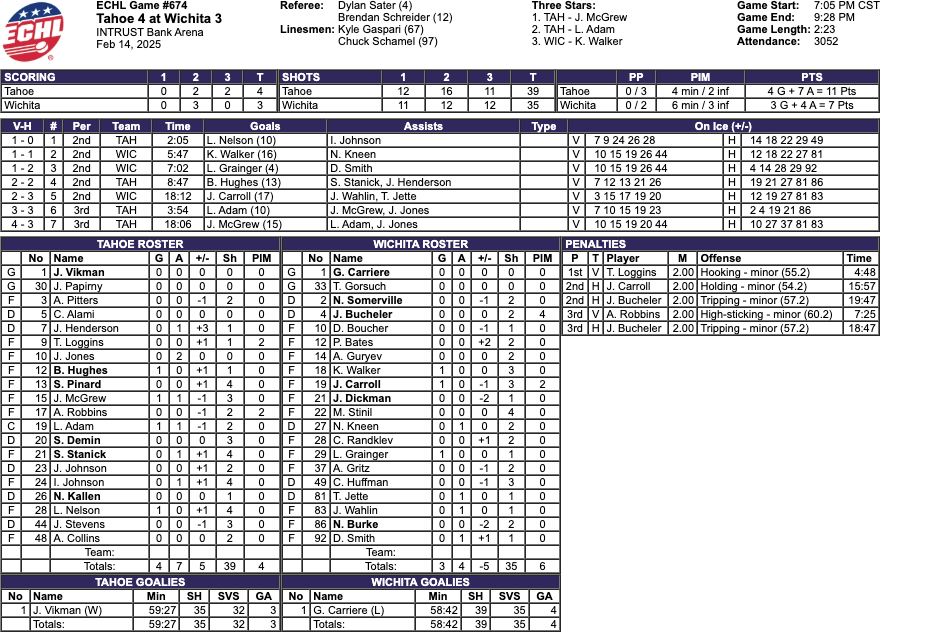 Thirty seconds after the Knight Monsters took the lead, Jeremie Bucheler of the Wichita Thunder received a penalty for tripping. The final score was 4-3 Tahoe Knight Monsters.