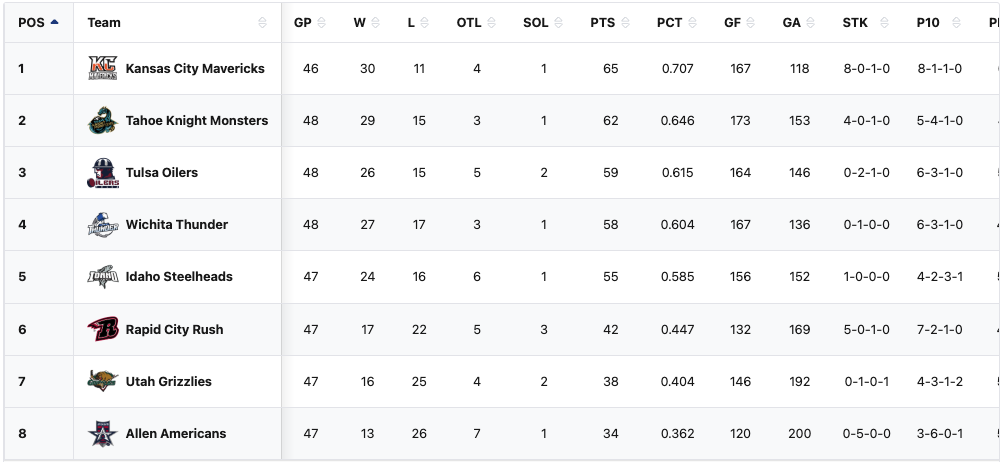 The Tahoe Knight Monsters have a record of 29-15-4 with 62 points in 48 games. The Knight Monsters are in 6th place in ECHL. They are in 3rd place in the ECHL Western Conference. They are in 2nd place in the ECHL Western Conference Mountain Division. They are in a playoff spot. They are seven points into a playoff spot. They have the second highest points percentage in the division. The Knight Monsters are ten points away from the top spot in the ECHL. The Knight Monsters are six points away from the top spot in the ECHL Western Conference.The Knight Monsters are three points away from the top spot in the ECHL Western Conference Mountain Division.