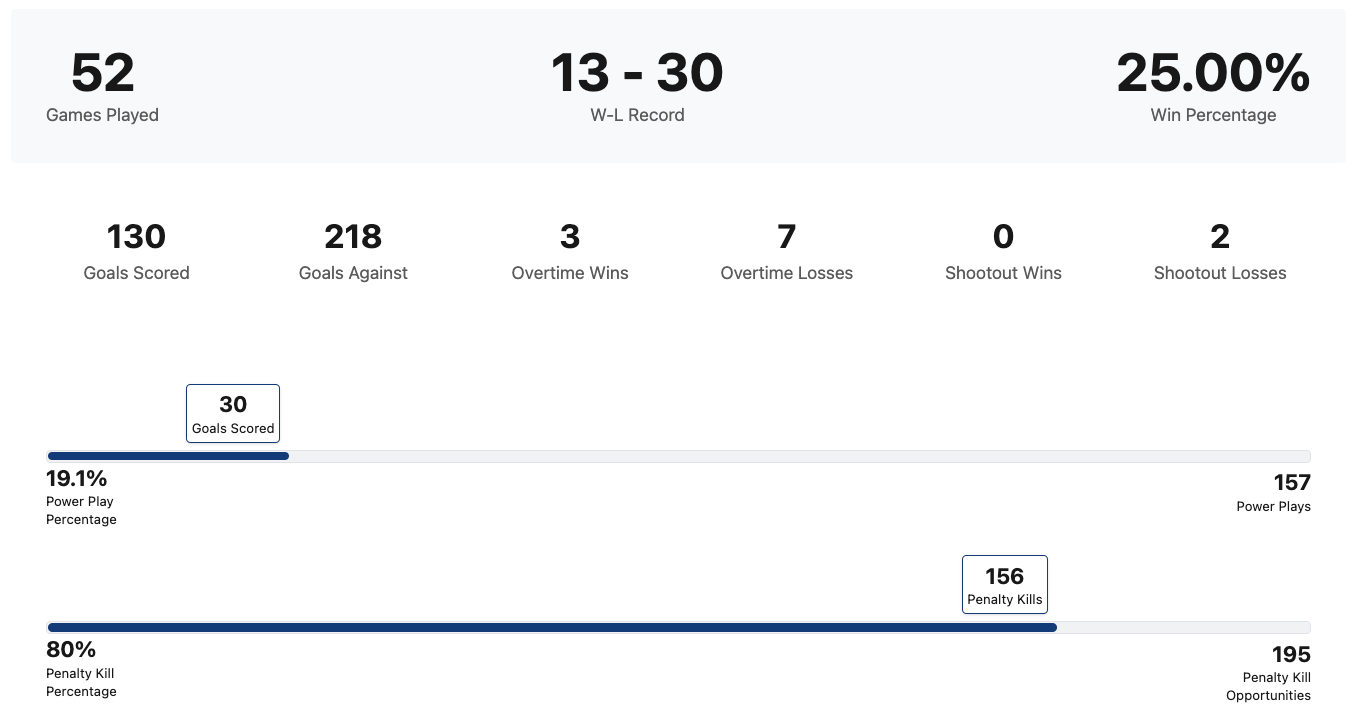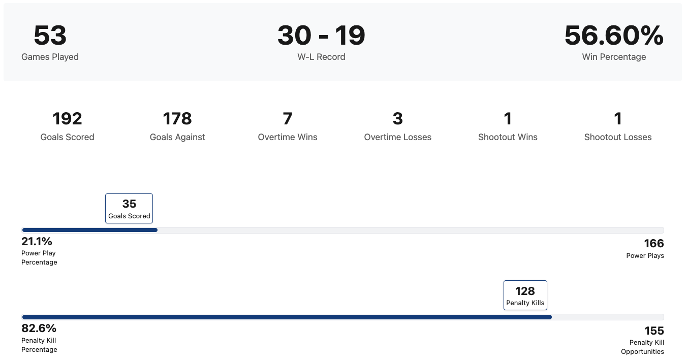 The Tahoe Knight Monsters have scored 192 goals this season. That is 3.62 goals per game. They are second in the ECHL for goals scored. The Knight Monster have allowed 178 goals this season. That is 3.35 goals against per game. They have allowed the seventh most goals in the ECHL this season. They have a goal differential of +14.