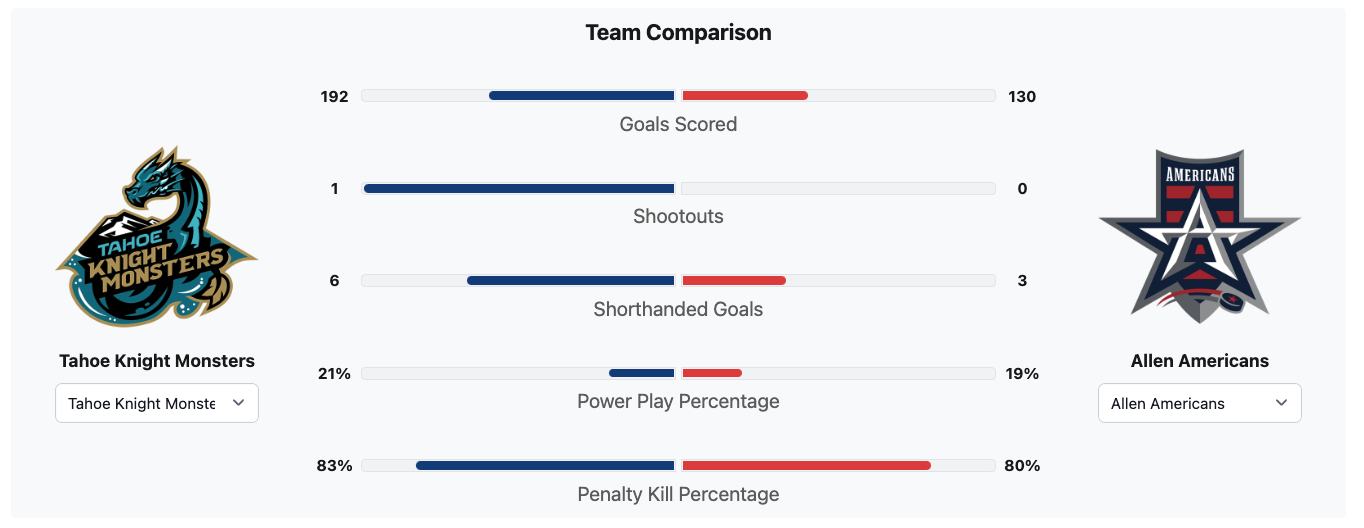 The Tahoe Knight Monsters have played one more game. The Knight Monsters have seventeen more wins. The Knight Monsters have the better points percentage. The Knight Monsters have scored sixty-two more goals. The Allen Americans have allowed forty more goals. The Knight Monsters have the better goal differential. The Knight Monsters have twenty-nine more points. The Tahoe Knight Monsters have 478 penalty minutes. The Americans have 649 penalty minutes.