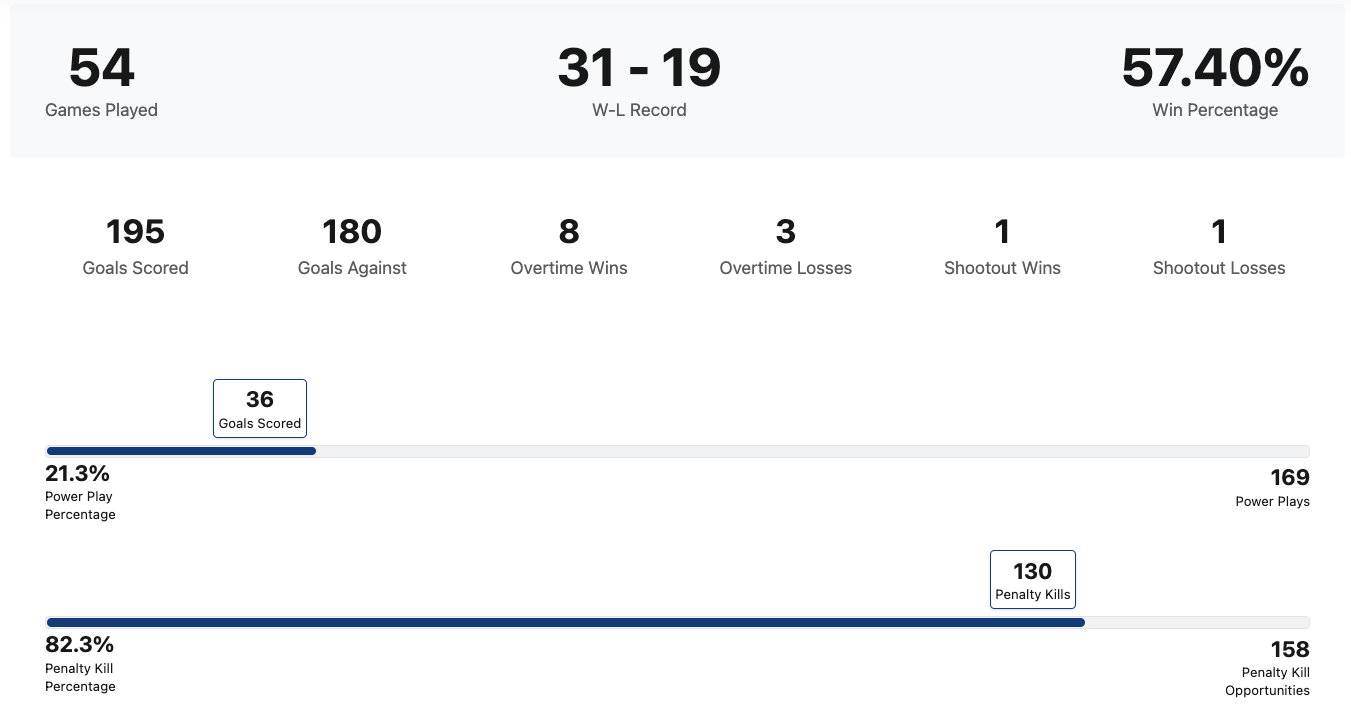 The Tahoe Knight Monsters have scored 195 goals this season. That is 3.54 goals per game. They are second in the ECHL for goals scored. The Knight Monster have allowed 180 goals this season. That is 3.27 goals against per game. They have allowed the eighth most goals in the ECHL this season. They have a goal differential of +15.