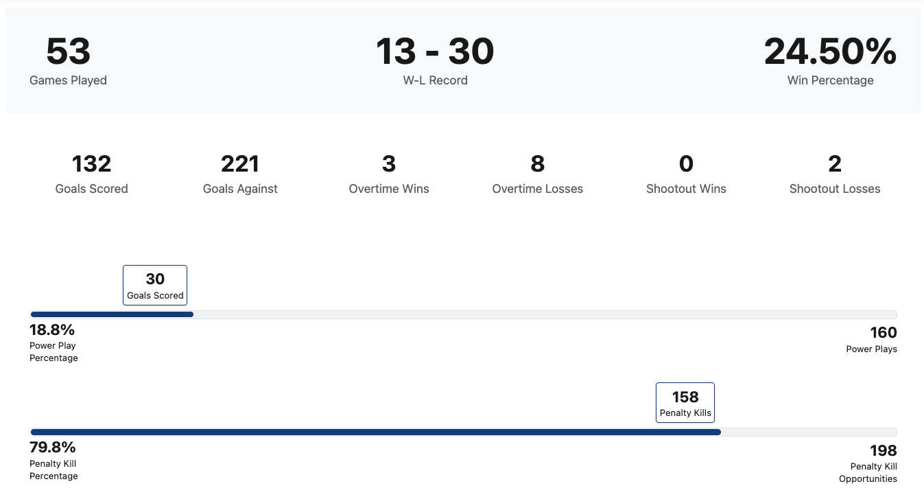 The Allen Americans have scored 132 goals this season. That is 2.49 goals per game. They have scored the fifth least goals in the ECHL this season. The Americans have allowed 221 goals so far this season. That is 4.16 goals against per game. The Americans are second in the ECHL in most goals allowed. The Americans have a goal differential of -89.