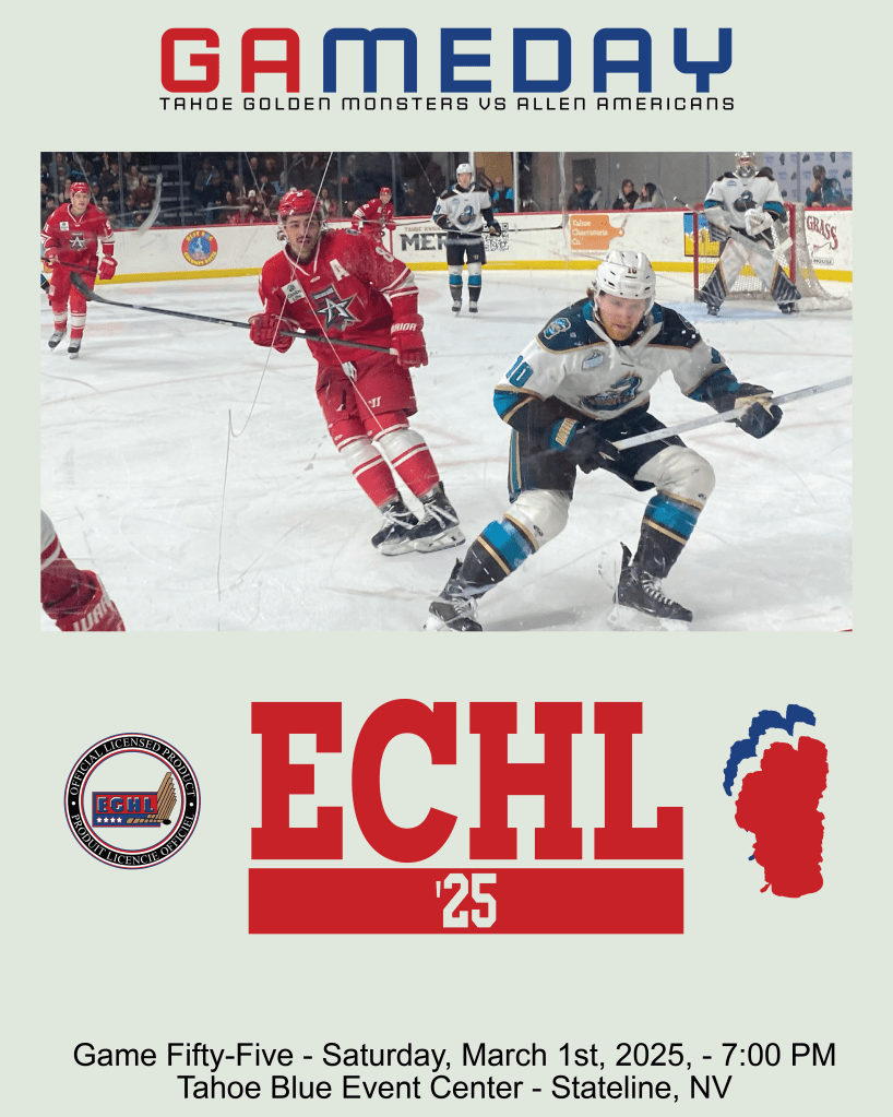 This is the Tahoe Knight Monsters 55th game of the season. The Tahoe Knight Monsters are the Vegas Golden Knights ECHL affiliate. They are coming off of a 3-2 overtime victory over the Allen Americans. The Tahoe Knight Monsters have a record of 31-19-4. The Knight Monsters are in 12th place in the ECHL. The Knight Monsters are 6th in the Western Conference and 3rd in the Mountain Division. The Allen Americans are the ECHL affiliate of Utah Hockey Club. The Americans have played fifty-three games this season. The Americans are coming off of a 2-3 overtime loss to the Tahoe Knight Monsters. They are on an eleven game losing streak. The Americans have a record of 13-31-9. The Americans are in 29th place in the ECHL. That is last place. The Americans are in 14th place in the ECHL Western Conference which is last. The Americans are in 8th place in the ECHL Western Conference Mountain Division which is also last. The all-time record between the Tahoe Knight Monsters and the Allen Americans is 3-0-0. They have played each other three times. The Knight Monsters have scored 11 goals on the Americans all time. The Knight Monsters have allowed the American to score 8 goals all time. The last time they played each other was on Friday, February 28th, 2025. The Knight Monsters won that game 3-2 in overtime.