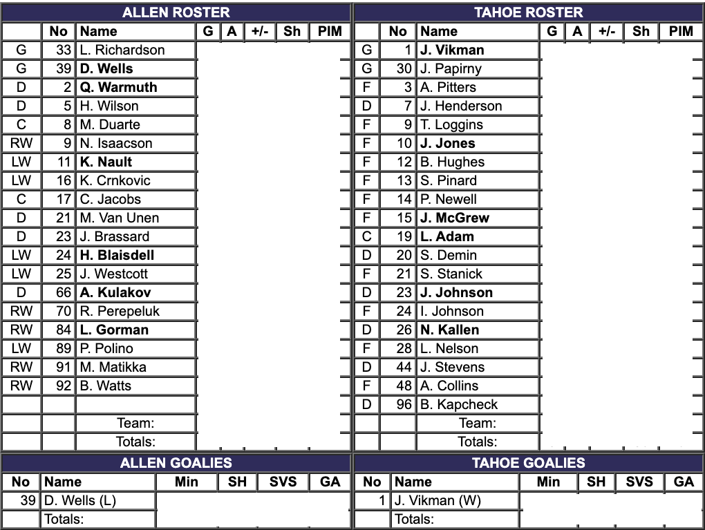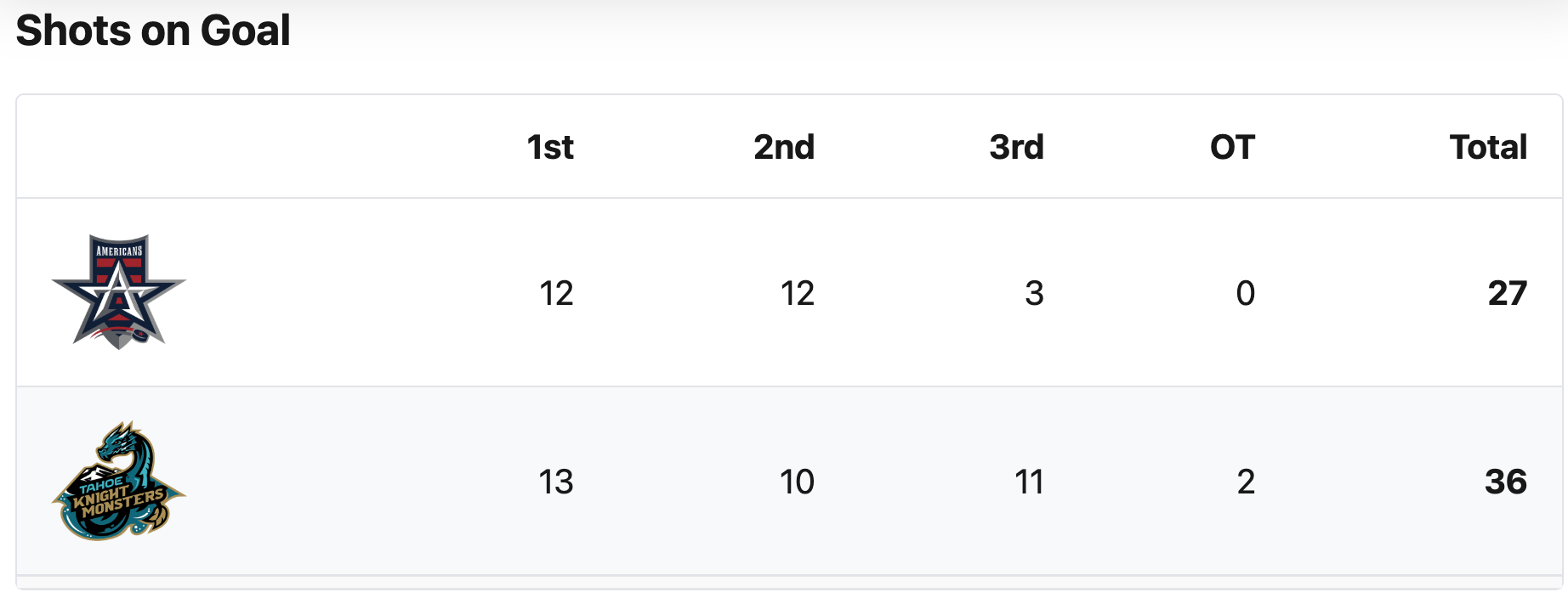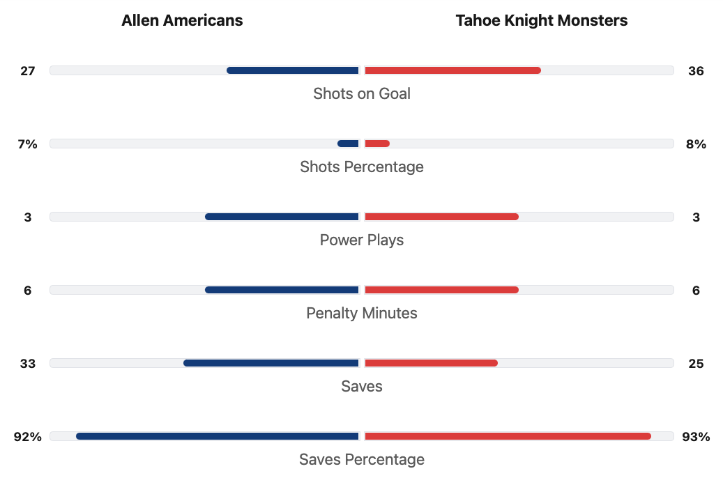 The Tahoe Knight Monsters had nine more shots. The Tahoe Knight Monsters had the better shot percentage. Both teams had six penalty minutes. #1 Jesper Vikman saved 25 shots for a 93% save percentage again. #39 Dylan Wells saved 33 shots for a 92% save percentage.