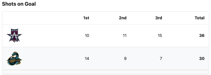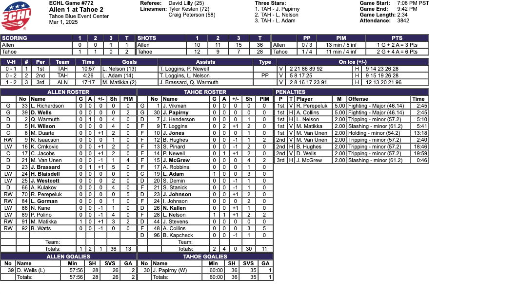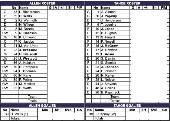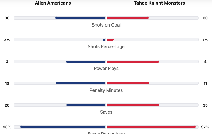The Allen Americans had six more shots. The Tahoe Knight monsters had the better shot percentage The Americans had two more penalty minutes. #30 Jordan Papirny saved 35 shots for a 97% save percentage again. #39 Dylan Wells saved 26 shots for a 93% save percentage.