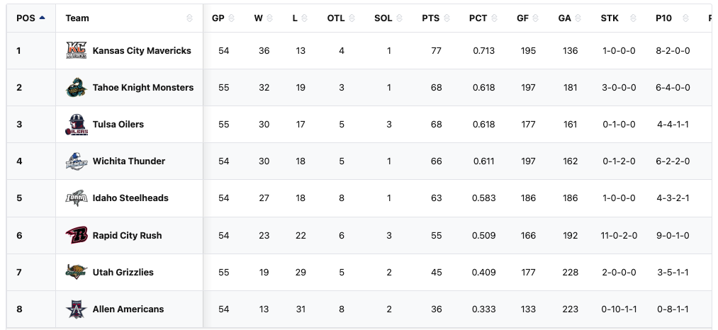The Tahoe Knight Monsters have a record of 32-19-4 with 68 points in 55 games. The Knight Monsters are now in 10th place in ECHL. They are now in 4th place in the ECHL Western Conference. They are now in 2nd place in the ECHL Western Conference Mountain Division. They are in a playoff spot. They are five points into a playoff spot. They have the second highest points percentage in the division. The Knight Monsters are thirteen points away from the top spot in the ECHL. The Knight Monsters are nine points away from the top spot in the ECHL Western Conference.The Knight Monsters are nine points away from the top spot in the ECHL Western Conference Mountain Division.