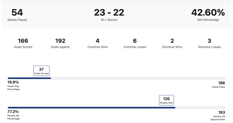 | Rapid City Rush | 54 | 23 | 22 | 9 | 166 | 192 | -26 | 55 |