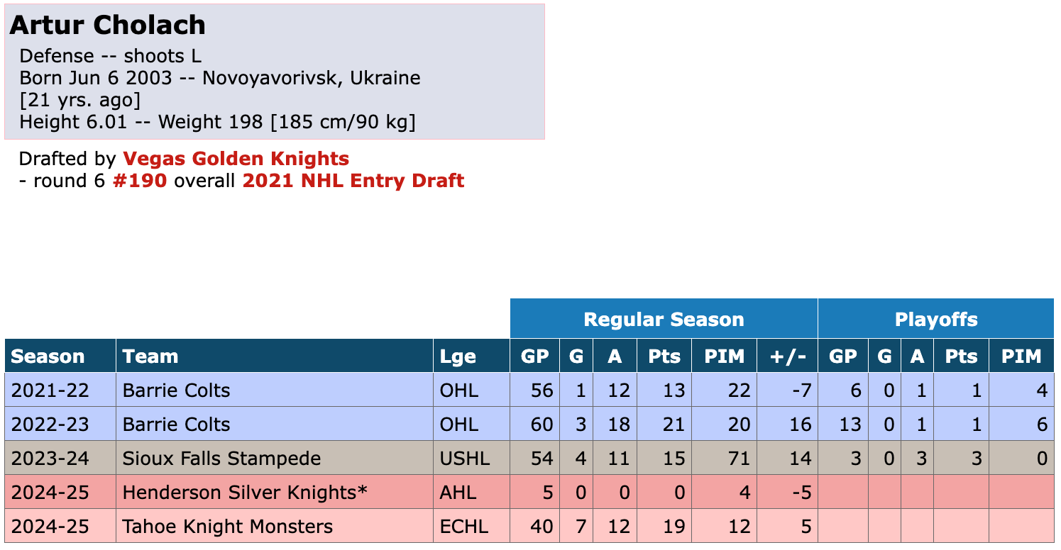 Defender Artur Cholach has been assigned to the Tahoe Knight Monsters by the Henderson Silver Knights. Cholach has played five games for the Henderson Silver Knights this season. He has zero goals with zero assists for zero total points in the American Hockey League this season. He has a +/- of -5 with 4 penalty minutes in the AHL this season. Cholach has played 40 games with the Tahoe Knight Monsters this season. He has scored 7 goals with 12 assists for 19 total points. He has 19 penalty minutes with a +/- of +5 in the ECHL this season.