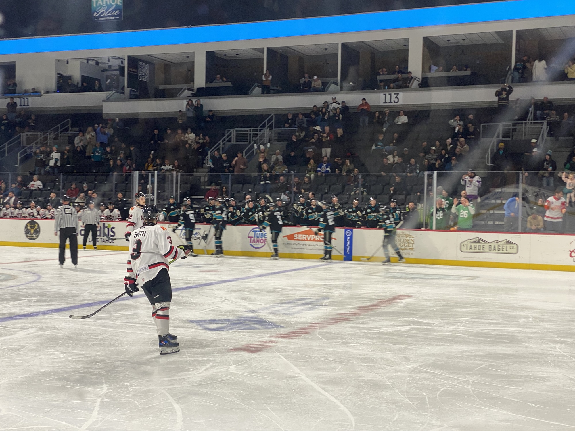With under seven minutes left in the first period, the Tahoe Knight Monsters tied the game. The Tying goal was scored by #10 Jett Jones. His goal was assisted by #15 Jake McGrew.
