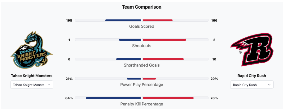 The Tahoe Knight Monsters had played two more games. The Knight Monsters had nine more wins. The Knight Monsters had the better points percentage. The Knight Monsters had scored thirty-two more goals. The Rapid City Rush had allowed seven more goals. The Knight Monsters had the better goal differential. The Knight Monsters had thirteen more points. The Tahoe Knight Monsters had 501 penalty minutes. The Rapid City Rush had 557 penalty minutes. Would the Tahoe Knight Monsters defend their fortress? Would the Rapid City Rush extend their point streak?