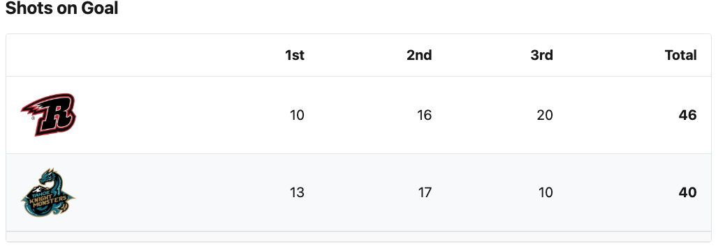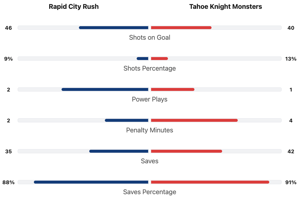 The The Rapid City Rush had six more shots. The Tahoe Knight Monsters had the better shot percentage The Knight Monsters had two more penalty minutes. #1 Jesper Vikman saved 42 shots for a 91% save percentage for the Tahoe Knight Monsters. #32 Connor Murphy saved 35 shots for an 88% save percentage for the Rapid City Rush.
