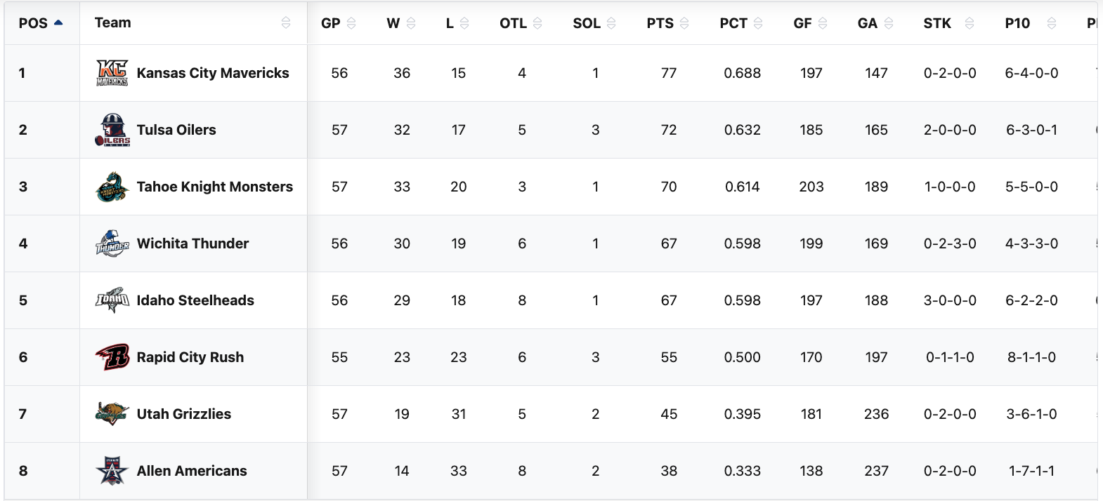 The Tahoe Knight Monsters have a record of 34-20-4 with 70 points in 57 games. The Knight Monsters are now in 10th place in ECHL. They are still in 6th place in the ECHL Western Conference. They are still in 3rd place in the ECHL Western Conference Mountain Division. They are in a playoff spot. They are only three points into a playoff spot. They have the third highest points percentage in the division. The Knight Monsters are still thirteen points away from the top spot in the ECHL. The Knight Monsters are now eight points away from the top spot in the ECHL Western Conference.The Knight Monsters are now seven points away from the top spot in the ECHL Western Conference Mountain Division.