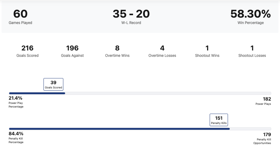 | Tahoe Knight Monsters | 60 | 35 | 20 | 5 | 216 | 196 | +20 | 75 |