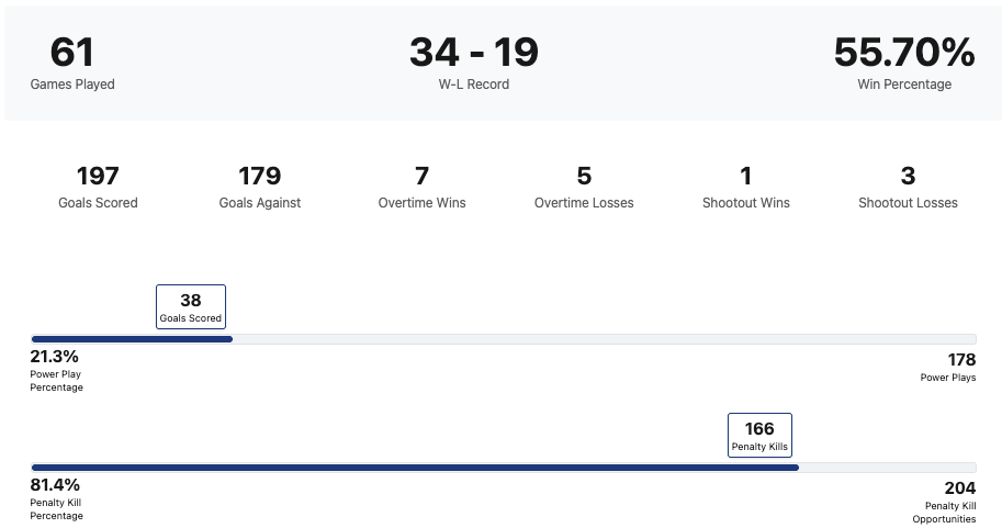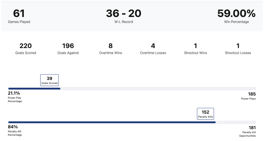 | Tahoe Knight Monsters | 61 | 36 | 20 | 5 | 220 | 196 | +24 | 77 |