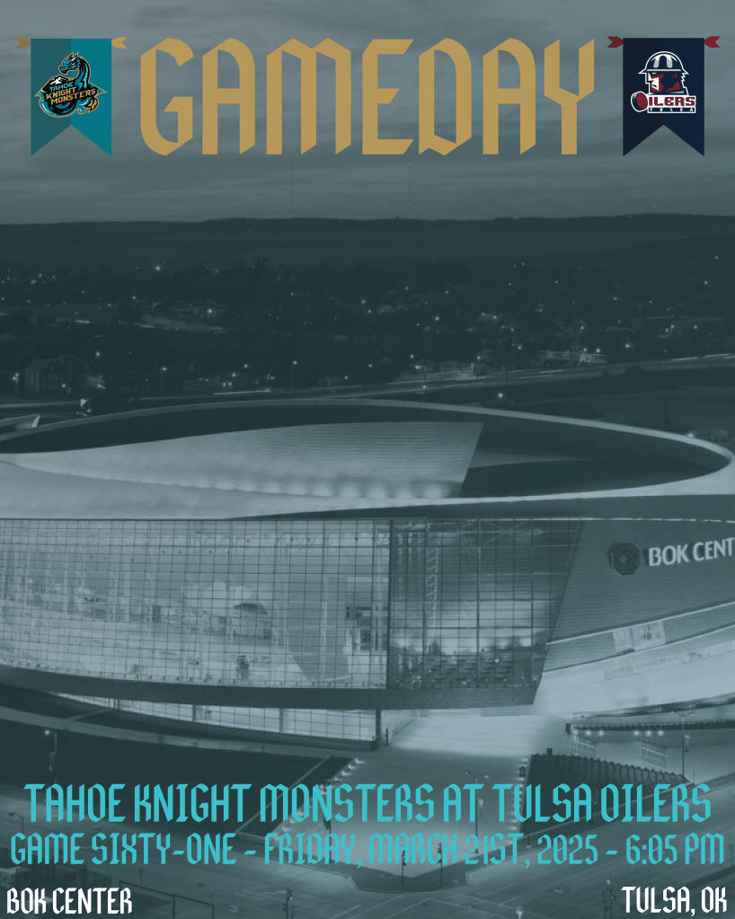 This is the Tahoe Knight Monsters 62nd game of the season. The Tahoe Knight Monsters are the Vegas Golden Knights ECHL affiliate. They are coming off of a 4-0 victory over the Idaho Steelheads. The Tahoe Knight Monsters have a record of 36-20-5. The Knight Monsters are in 8th place in the ECHL. The Knight Monsters are 4th in the Western Conference and 2nd in the Mountain Division. The Tulsa Oilers are the ECHL affiliate of the Anaheim Ducks. The Oilers have played sixty-one games this season. The Tulsa Oilers are coming off of a 2-4 loss to the Bloomington Bison. The Oilers have a record of 34-19-8. The Oilers are in 10th place in the ECHL. The Oilers are in 5th place in the ECHL Western Conference. The Oilers are in 3rd place in the ECHL Western Conference Mountain Division. The all-time record between the Tahoe Knight Monsters and the Tulsa Oilers is 5-1-2. They have played each other seven times. The Knight Monsters have scored 32 goals on the Oilers all time. The Knight Monsters have allowed the Steelheads to score 23 goals all time. The last time they played each other was on Sunday, December 29th, 2024. The Knight Monsters won that game 4-3 in overtime.