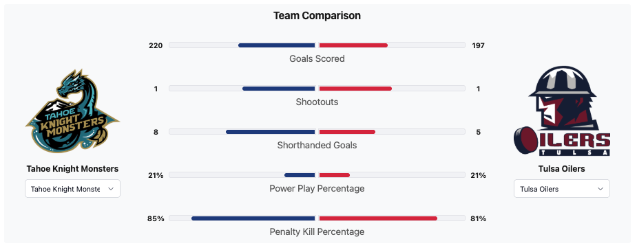 Both teams had played sixty-one games. The Knight Monsters had two more wins. The Knight Monsters had the better points percentage. The Knight Monsters had scored twenty-three more goals. The Knight Monsters had allowed seventeen more goals. The Knight Monsters had the better goal differential. The Knight Monsters had one more point. The Tahoe Knight Monsters had 539 penalty minutes. Which was the least in the ECHL. The Tulsa Oilers had 670 penalty minutes.