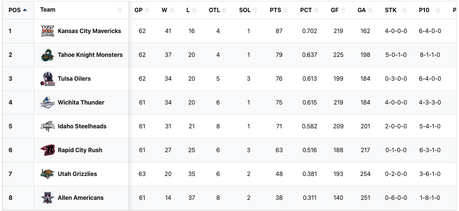 The Tahoe Knight Monsters have a record of 38-20-5 with 79 points in 62 games. The Knight Monsters are still in 8th place in ECHL. They are still in 4th place in the ECHL Western Conference. They are still in 2nd place in the ECHL Western Conference Mountain Division. They are in a playoff spot. They are now eight points into a playoff spot. They have the second highest points percentage in the division. The Knight Monsters are fifteen points away from the top spot in the ECHL. The Knight Monsters are eight points away from the top spot in the ECHL Western Conference. The Knight Monsters are six points away from the top spot in the ECHL Western Conference Mountain Division.