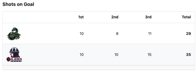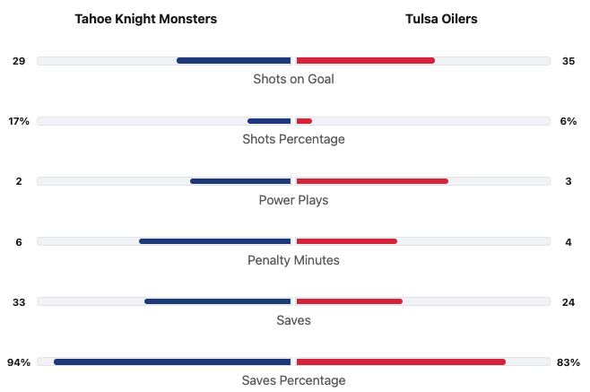 The Tulsa Oilers had six more shots. The Tahoe Knight Monsters had the better shot percentage. The Knight Monsters had two more penalty minutes. #1 Jesper Vikman saved 33 shots for a 94% save percentage for the Tahoe Knight Monsters. #30 Vyacheslav Buteyets saved 24 shots for an 83% save percentage for the Tulsa Oilers.