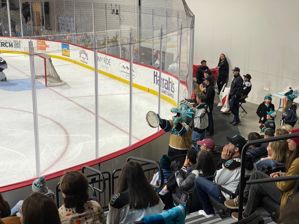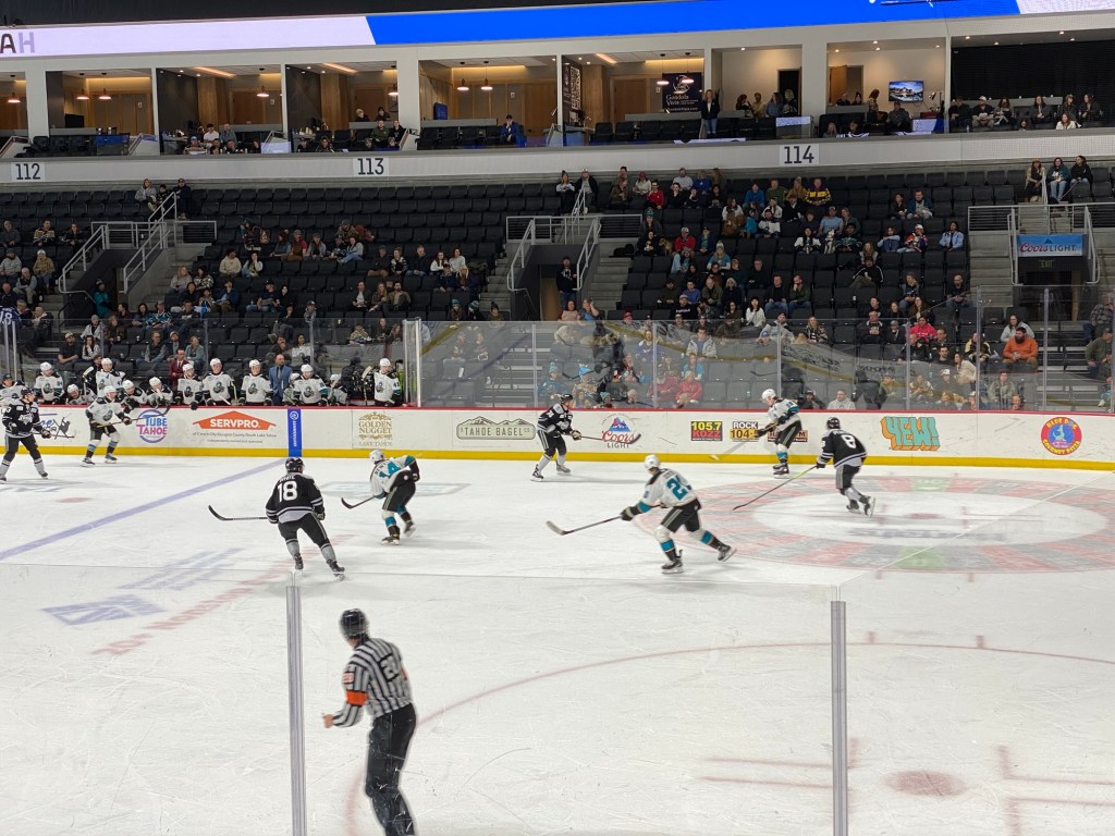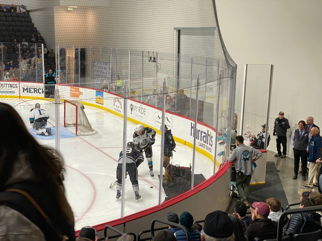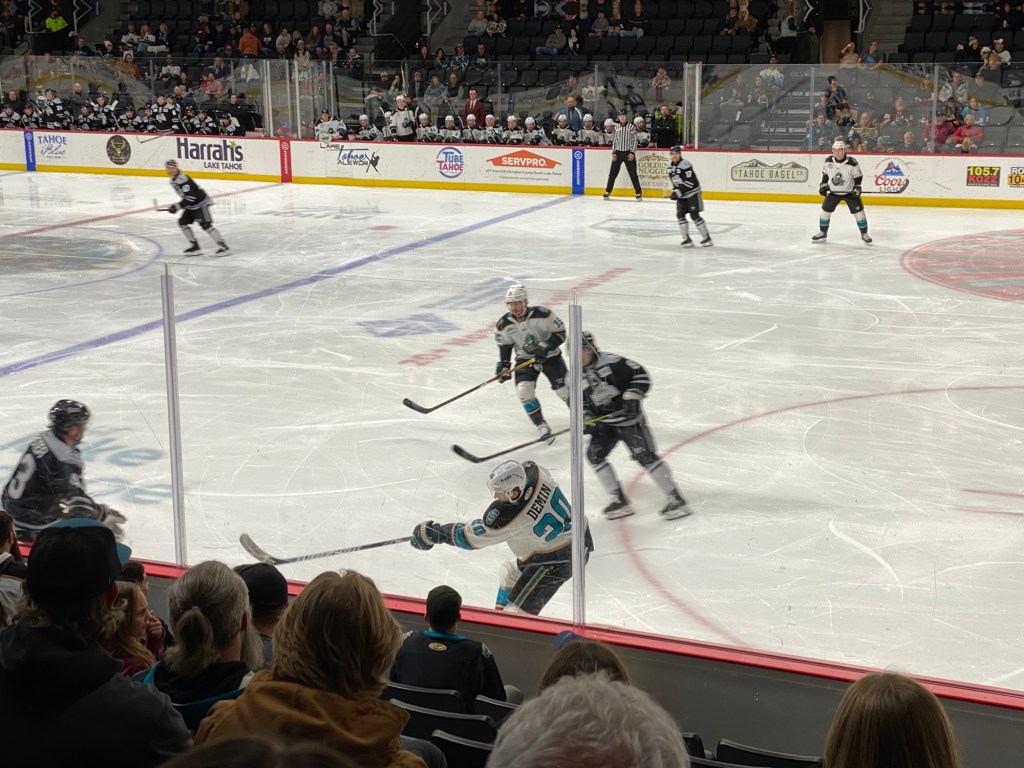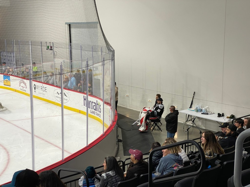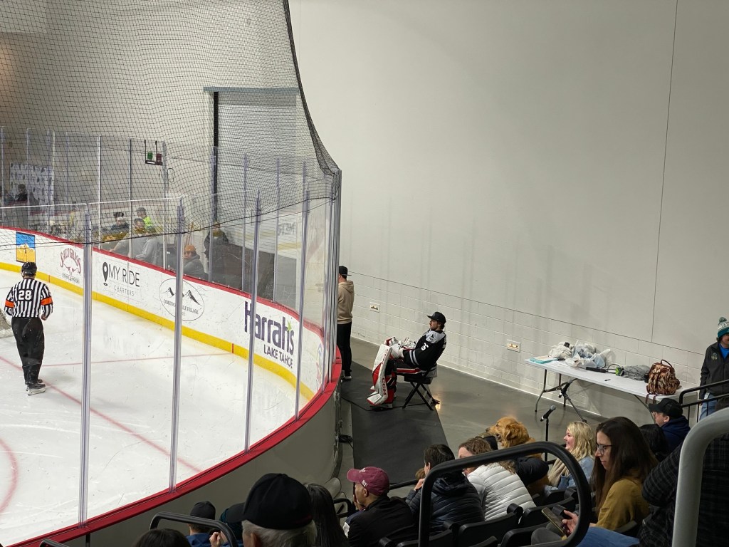 The Idaho Steelheads backup goalie sat on a chair near the entrance to the rink. This is the first time I have seen that at a Knight Monsters game. Usually they are on the bench. took the lead in the first period. The Tahoe Knight Monsters tied the game in the second period. The Knight Monsters got the offense rolling in the third period with four goals in five minutes. The game started off slow. It had its chippy moments. Then the Knight Monsters found their grove. The Knight Monsters ended the Steelheads winning streak. The Knight Monsters extended their point streak to eight games. The Knight Monsters extended their winning streak to five games.