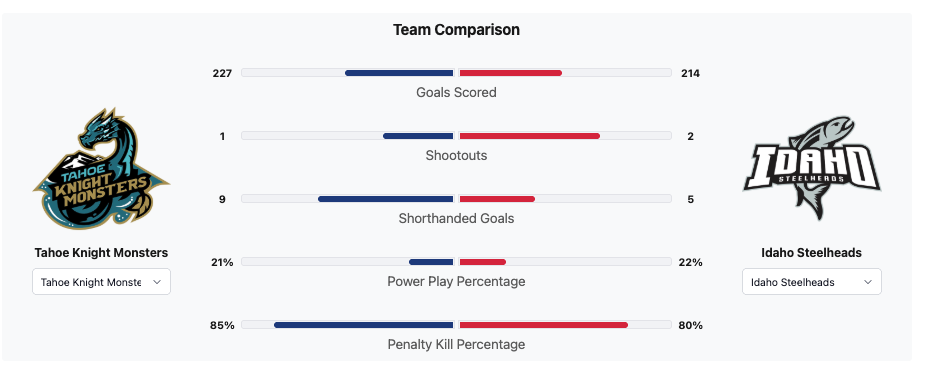 The Tahoe Knight Monsters had played one more game. The Knight Monsters had six more wins. The Knight Monsters had the better points percentage. The Knight Monsters had scored thirteen more goals. The Idaho Steelheads had allowed four more goals. The Knight Monsters had the better goal differential. The Knight Monsters had eight more points. The Tahoe Knight Monsters had 547 penalty minutes. The Idaho Steelheads had 721 penalty minutes.
