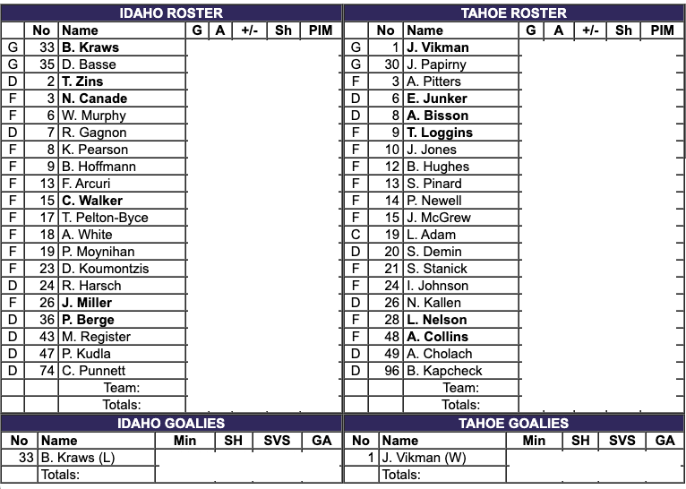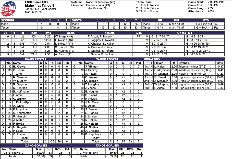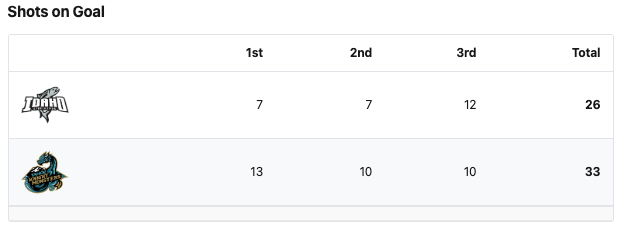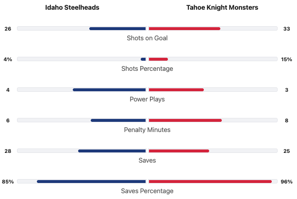 The Tahoe Knight Monsters had seven more shots. The Tahoe Knight Monsters had the better shot percentage. The Knight Monsters had two more penalty minutes. #1 Jesper Vikman saved 25 shots for a 96% save percentage for the Tahoe Knight Monsters. #33 Ben Kraws saved 28 shots for an 85% save percentage for the Idaho Steelheads.