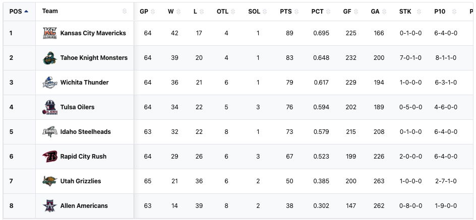 The Tahoe Knight Monsters have a record of 40-20-5 with 83 points in 64 games. The Knight Monsters are in 7th place in ECHL. They are in 3rd place in the ECHL Western Conference. They are still in 2nd place in the ECHL Western Conference Mountain Division. They are in a playoff spot. They are ten points into a playoff spot. They have the second highest points percentage in the division. The Knight Monsters are fourteen points away from the top spot in the ECHL. The Knight Monsters are eight points away from the top spot in the ECHL Western Conference. The Knight Monsters are six points away from the top spot in the ECHL Western Conference Mountain Division.