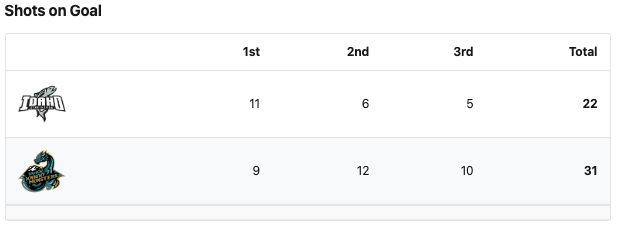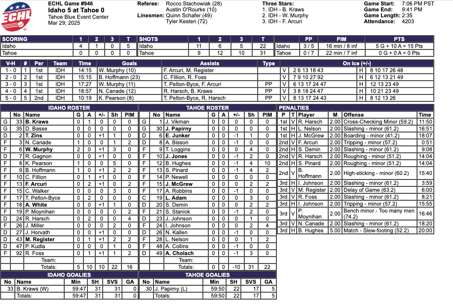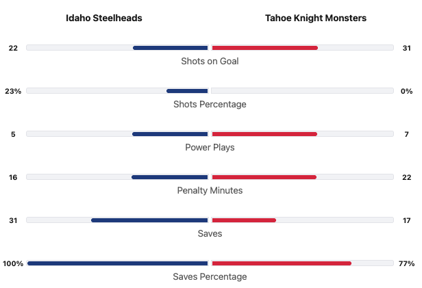 The final score was 5-0 Idaho Steelheads. This is the second game this season where the Tahoe Knight Monsters did not score. This is the first time they have not scored a goal at home.