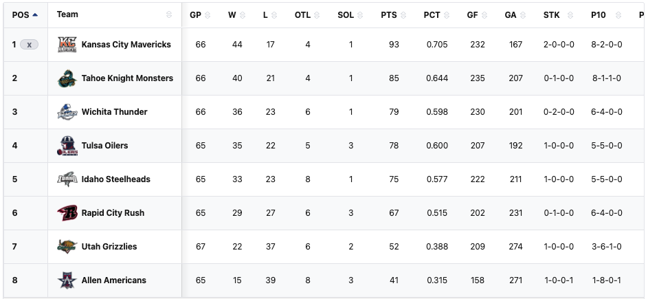 The Tahoe Knight Monsters had played one more game. The Knight Monsters had eight more wins. The Knight Monsters had the better points percentage. The Knight Monsters had scored eighteen more goals. The Idaho Steelheads had allowed nine more goals. The Knight Monsters had the better goal differential. The Knight Monsters had twelve more points. The Tahoe Knight Monsters had 563 penalty minutes. The Idaho Steelheads had 733 penalty minutes.