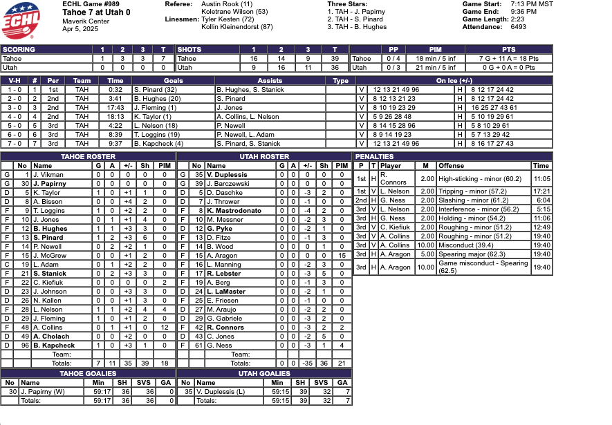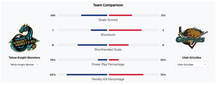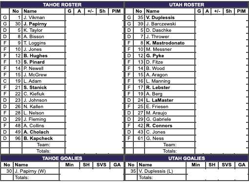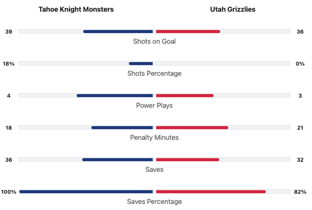 The Tahoe Knight Monsters had three more shots. The Tahoe Knight Monsters had the better shot percentage. The Utah Grizzlies had three more penalty minutes. #30 Jordan Papirny saved 36 shots for a 100% save percentage for the Tahoe Knight Monsters. This was his fourth shutout of the season. #35 Vinny Duplessis saved 32 shots for an 82% save percentage for the Utah Grizzlies.