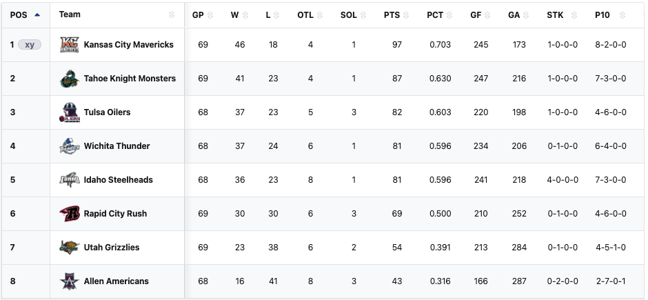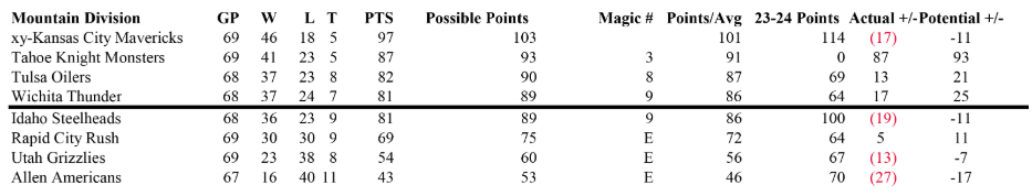 The Tahoe Knight Monsters have a record of 41-23-5 with 87 points in 69 games. The Knight Monsters are still in 7th place in ECHL. They are still in 3rd place in the ECHL Western Conference. They are still in 2nd place in the ECHL Western Conference Mountain Division. They are in a playoff spot. They are six points into a playoff spot. They have the second highest points percentage in the division. The Tahoe Knight Monsters need three points to secure a playoff spot. The Knight Monsters need another win and a shootout or overtime loss to secure a playoff spot as things stand. With three games left, the Knight Monsters need to win at least one and force at least one game into overtime. However, if the Knight Monsters win one more game, and the Idaho Steelheads lose one more game, the Knight Monsters may be able to secure a playoff spot that way. There is a high chance that the Knight Monsters make the playoffs. The Idaho Steelheads would have to win all four of their remaining games, the Tulsa Oilers would have to find five points in their last four games, and the Wichita Thunder would have to find six points in their last four games with the Knight Monsters losing their final three games to eliminate the Tahoe Knight Monsters from playoff contention. With the Knight Monsters playing the Thunder next, I do not think that is going to happen.