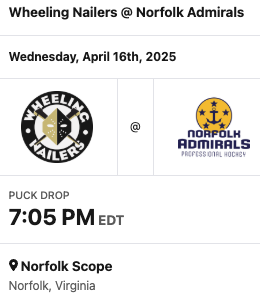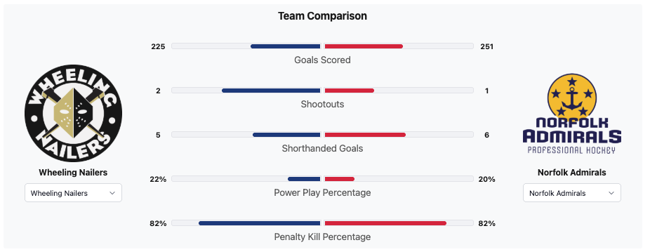The number two seed Wheeling Nailers are taking on the number three seed Norfolk Admirals. The Wheeling Nailers are the Pittsburgh Penguins affiliate. The Norfolk Admirals are the Winnipeg Jets affiliate. The Nailers finished the regular season with a win percentage of 62%. The Admirals finished the regular season with a win percentage of 60%. Their record against each other this season was 1-1-0. They last played each other on Saturday, January 4th, 2025. The Admirals won that game 9-3. The Wheeling Nailers are 7-3-0 in their last ten regular season games. They finished the regular season with a loss. The Norfolk Admirals are 5-3-2 in their last ten regular season games. They finished the regular season with back-to-back losses.