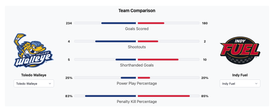 The number one seed Toledo Walleye are taking on the number four seed Indy Fuel. The Walleye are the Detroit Red Wings affiliate. The Fuel are the Chicago Blackhawks affiliate. The Walleye finished the regular season with a win percentage of 68%. The Fuel finished the regular season with a win percentage of 51%. Their record against each other this season was 2-1-1. Both teams won a game in regulation, lost a game in regulation, and lost a game in overtime or a shootout against each other. They last played each other on Sunday, April 13th, 2025. The Walleye won that game 4-3 in overtime. The Toledo Walleye are 5-2-3 in their last ten regular season games. They finished the regular season with a win. The Indy Fuel are 5-3-2 in their last ten regular season games. They finished the regular season with three straight losses.