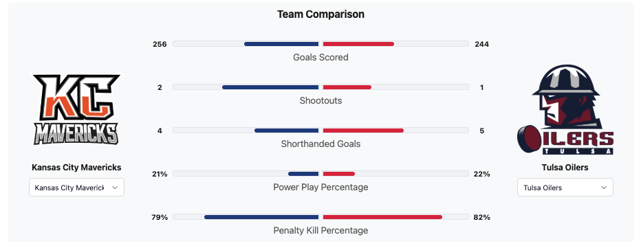 The number one seed Kansas City Mavericks are taking on the number four seed Tulsa Oilers. The Kansas City Mavericks are the Seattle Kraken affiliate. The Tulsa Oilers are the Anaheim Ducks affiliate. The Mavericks finished the regular season with a win percentage of 71%. The Oilers finished the regular season with a win percentage of 61%. The Kansas City Mavericks won their regular season series with a record of 5-3-0. They last played each other on February 16th, 2025. The Oilers won that game 2-1. The Kansas City Mavericks are 8-2-0 in their last ten regular season games. They finished the regular season with four straight wins. The Tulsa Oilers are 6-4-0 in their last ten regular season games. They finished the regular season with three straight wins.