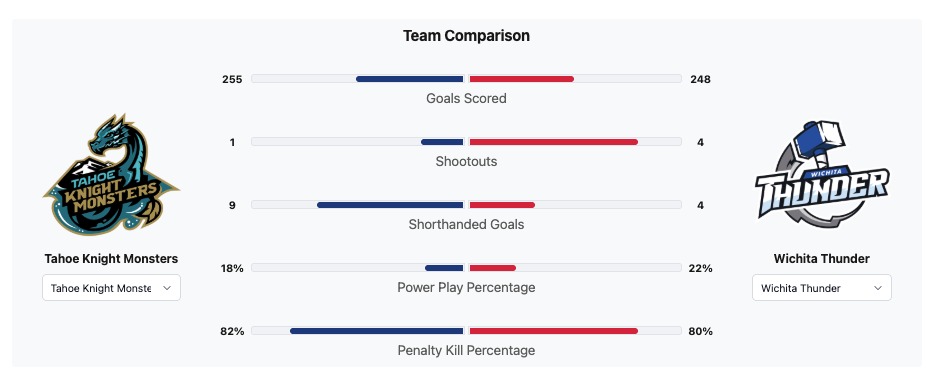 The number two seed Wichita Thunder are taking on the number three seed Tahoe Knight Monsters. The Wichita Thunder are the San Jose Sharks affiliate. The Tahoe Knight Monsters are the Vegas Golden Knights affiliate. The Thunder finished the regular season with a win percentage of 61%. The Knight Monsters finished the regular season with a win percentage of 61%. The Wichita Thunder won their regular season series. They last played each other on April 12th, 2025. The Thunder won that game 3-1. The Wichita Thunder are 6-4-0 in their last ten regular season games. They finished the regular season with four wins in a row. The Tahoe Knight Monsters are 4-5-1 in their last ten regular season games. They finished the regular season with three straight losses.