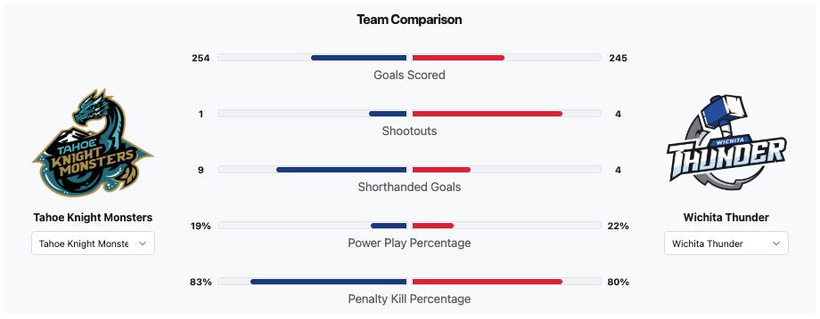 Both teams had played seventy-one games. The Knight Monsters had one more win. The Knight Monsters had the better points percentage. The Knight Monsters had scored nine more goals. The Knight Monsters had allowed twelve more goals. The Wichita Thunder had the better goal differential. The Knight Monsters had one more point. The Tahoe Knight Monsters had 633 penalty minutes. The Wichita Thunder had 672 penalty minutes.