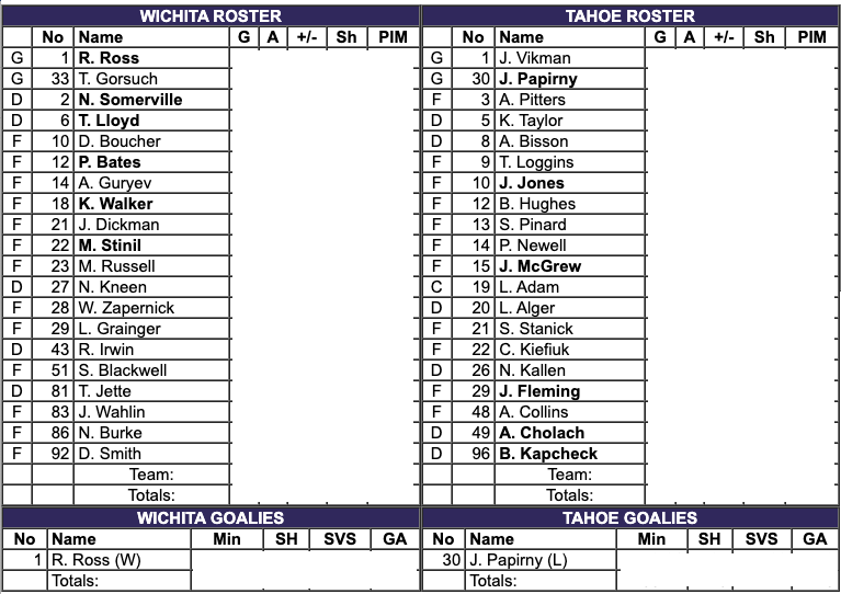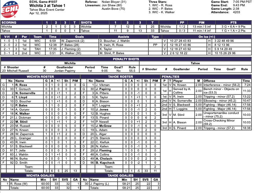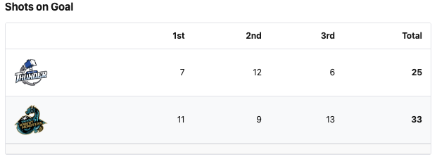 The Tahoe Knight Monsters had eight more shots. The Wichita Thunder had the better shot percentage. The Thunder had two more penalty minutes. #30 Jordan Papirny saved 22 shots for a 88% save percentage for the Tahoe Knight Monsters. #1 Roddy Ross saved 32 shots for a 97% save percentage for the Wichita Thunder.