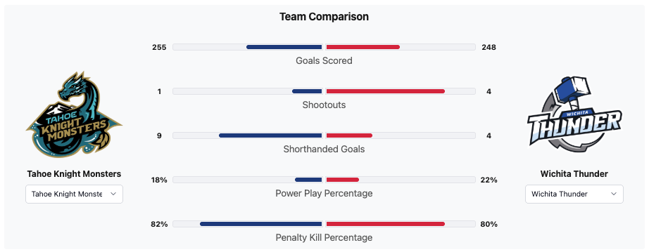 The Wichita Thunder finished the regular season with one more win. The Thunder finished the regular season with the better points percentage. The Tahoe Knight Monsters scored seven more goals during the regular season. The Knight Monsters allowed fourteen more goals during the regular season. The Knight Monsters had the better goal differential during the regular season. The Thunder finished the regular season with one more point.