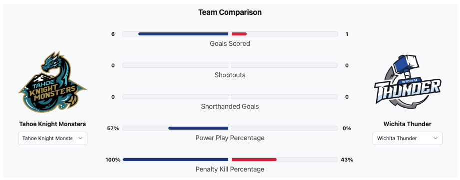 The Tahoe Knight Monsters have two more 2025 Kelly Cup Playoff wins. The Knight monsters currently lead the series 2-0. The Tahoe Knight Monsters scored twelve more goals during the postseason. The Wichita Thunder have allowed twelve more goals during the postseason. The Knight Monsters have the better goal differential in the postseason. The Tahoe Knight Monsters have 22 penalty minutes so far in the Kelly Cup Playoffs. The Wichita Thunder have 28 penalties so far in the Kelly Cup Playoffs.